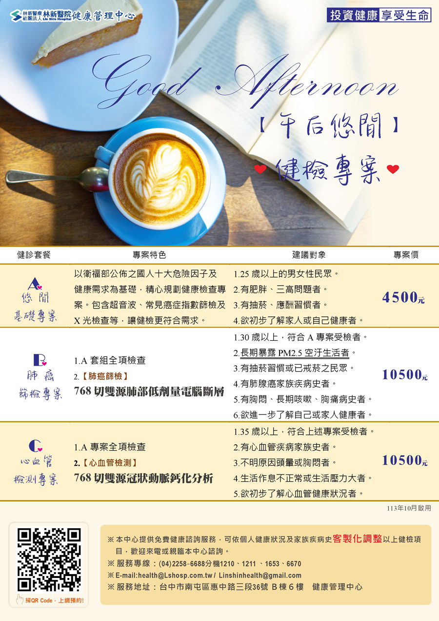 ※本專案適用每週三下午時段,敬請提早一個月預約,謝謝。