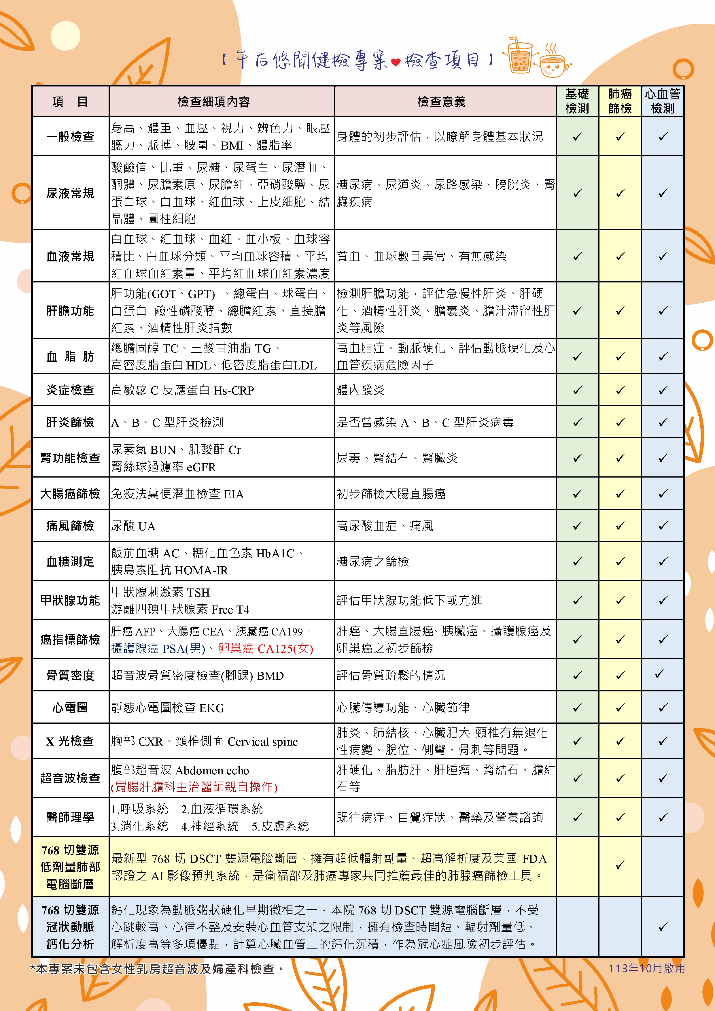 ※因本專案檢查項目較多,敬請提早兩週預約,謝謝。