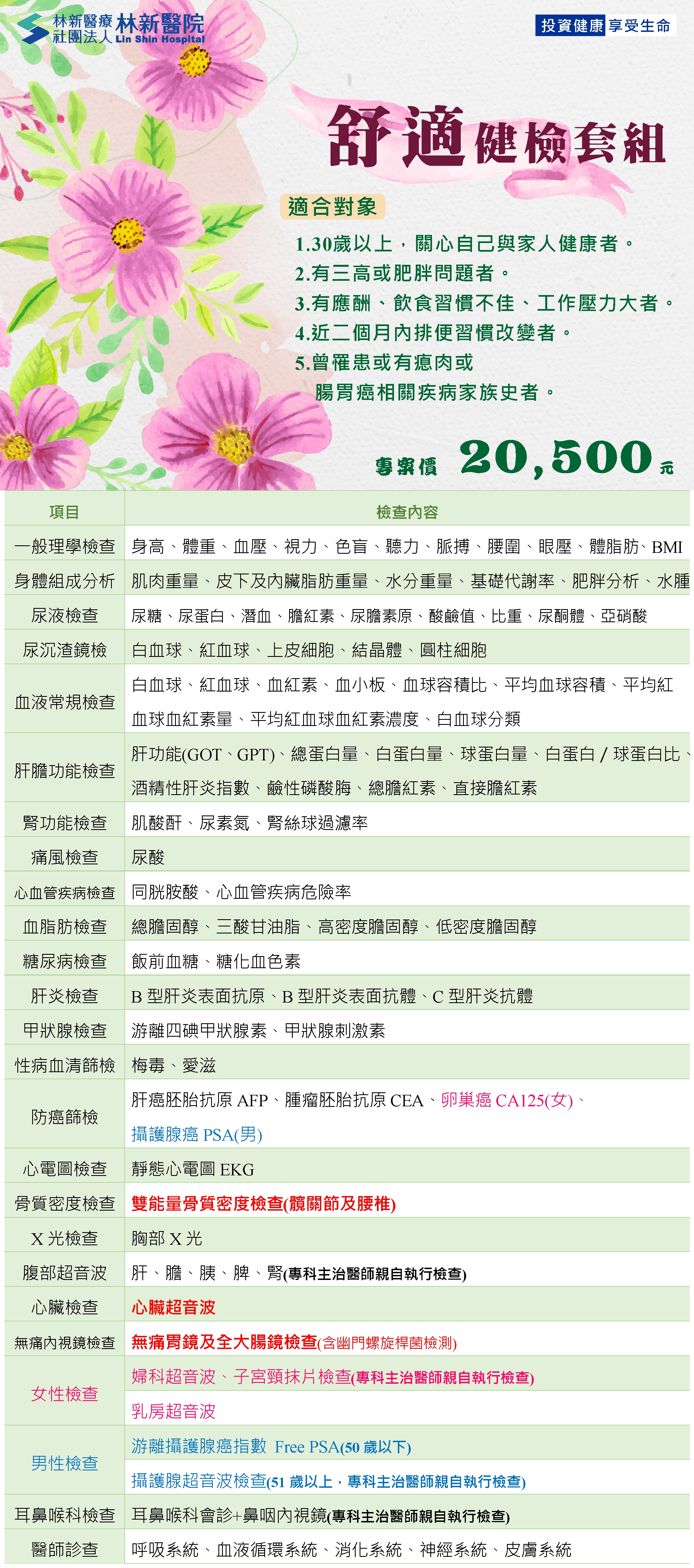 ※因本專案檢查項目較多,敬請提早一個月預約,謝謝。