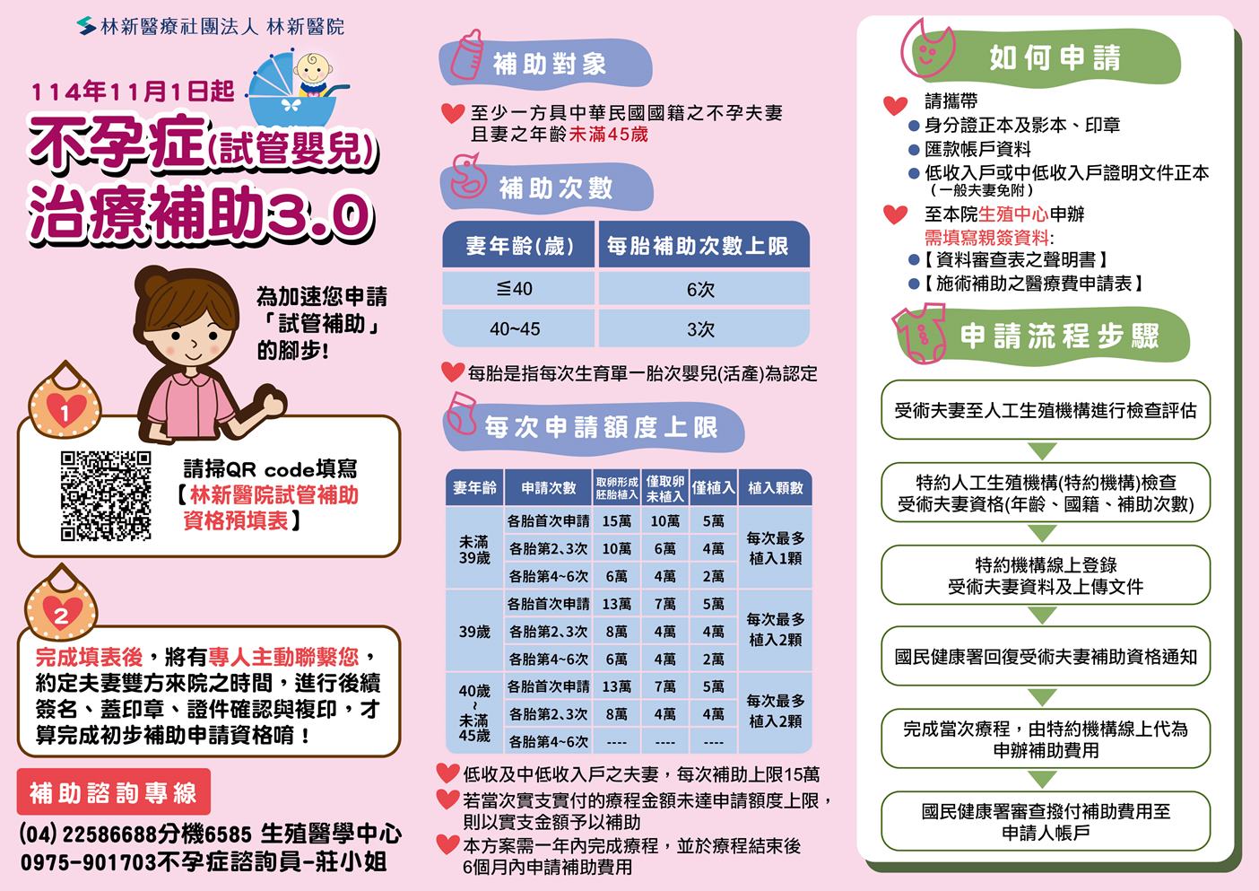 為加速您申請「試管補助」的腳步,請先填寫【林新醫院試管補助資格預填表】 林新醫院試管補助資格預填表